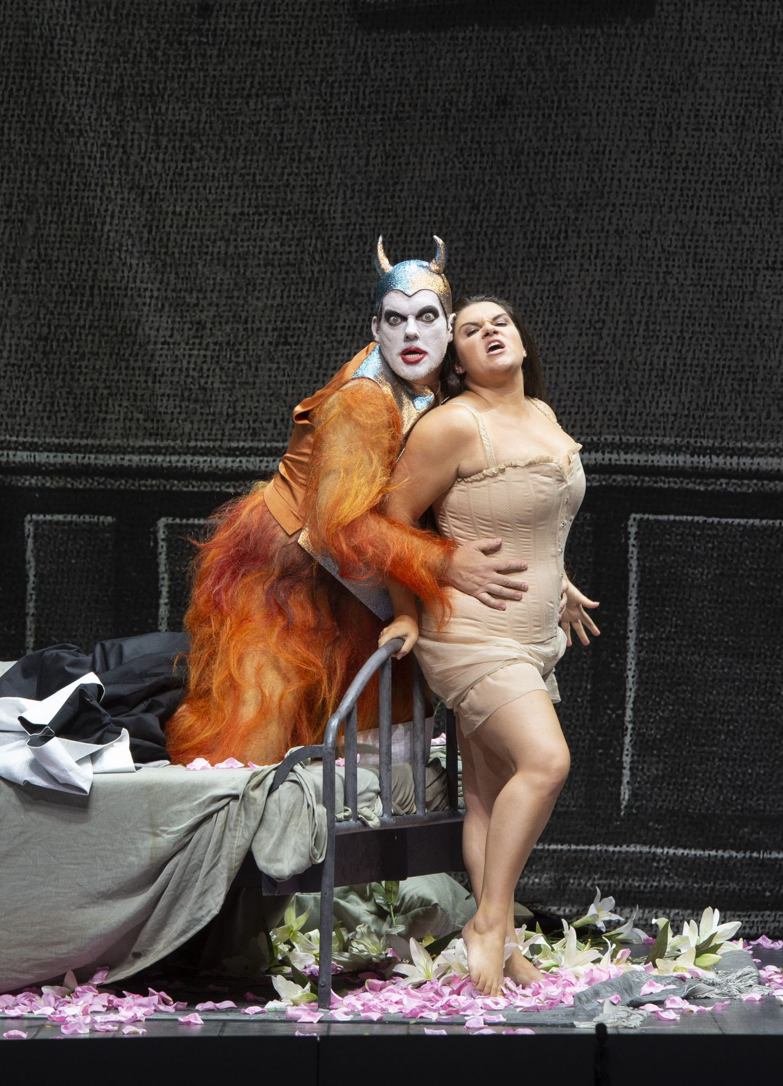 Behind this colorful abundance of glitter, gold, colorful costumes, never-stopping movement and constant allusions of the actors’ (trans-) sexuality, Kosky appears as a knowledgeable, highly talented director, who is genuinely in love with the strong women. The latter receive a special place in this production and defy the typical image of an operetta diva. Thus, the Eurydice is not a model, but a woman of flesh and blood who is not afraid to acknowledge her sexuality publicly. She shows off the attached male genitalia of an impressive size and is the one who drags men in the bed. The goddess Venus, on the other hand, is not an exact Venus from the Hohlefels, but a lean, insecure, pitiful creature, who nevertheless knows how to pull her erotic strings. Public Opinion transforms from a strict teacher in a high-necked dress to a free spirit in a rainbow dress. Even the god of love Cupid is a beautiful woman, with a full female body. The above mentioned (trans-) sexuality plays a vital role in this staging. The male Cancan dancers wear pink ruffled skirts that are very reminiscent of female genitalia. And an entire ballet sometimes acts as sexy, androgynous bees or almost naked and extremely good looking devils.